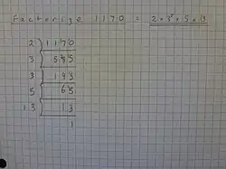 A common requirement is to reduce a number to its prime factors. This is used particularly in working with vulgar fractions. The dividend is successively divided by prime numbers, repeating where possible: