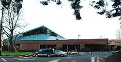 A $2.6 million bond measure went before voters in September 1979 to finance construction of an indoor pool, along with a second operating levy to pay for the operations.[7] The plan called for a main pool, a sauna, racquetball courts, a shallow pool for children, and a hydrotherapy pool, among other amenities.[7] Voters passed both of the measures for what would be a 26,777-square-foot (2,487.7 m2) center, with construction beginning in summer 1980.[8][9] The aquatics center was completed in 1981 and opened in September that year.[10] The facility included an indoor pool with locker rooms, a weight room, and three racquetball courts.[11] The new center cost $2.5 million to build,[11] with C.A. Lantz Construction Co. serving as the general contractor.[8] The project faced several delays due to leaks in the roof.[8][12]
