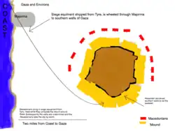 Upon arriving, Alexander camped near the southern side of the city and deemed the southern walls as the weakest.[7] It is alleged that the mounds were built quickly, despite the engineers' belief they could not be completed due to the nature of Gaza's fortifications.[8]