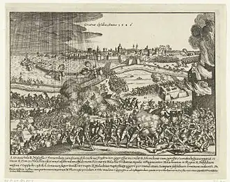 A few days later, the Spanish army, commanded by the Prince of Parma, laid siege to Venlo, garrisoned and supported by Dutch and English troops led by Maarten Schenck and Sir Roger Williams.[6] On 28 June 1586 the garrison was forced to capitulate to the Spaniards.[6][7]