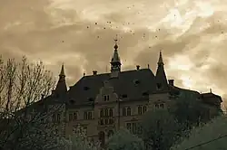The City Hall of Sighişoara, Romania, is located near to Monastery Church. The building was built between 1887 and 1888. In the upper floor there is a baroque hall, which hosts an Academic Music festival and many other concerts of prestigious bands.