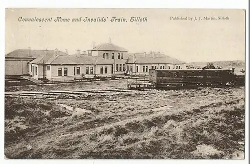 Cumberland and Westmorland Convalescent Institution railway station was a terminus off the short Blitterlees Branch off the Carlisle and Silloth Bay Railway, within Silloth itself.[6] The larger railway ran from Carlisle, England. The station does not appear on standard railway maps,[7] but it can be discerned with a magnifying glass on at least two published maps[8] and clearest of all on the 1914 25" OS map.[9]