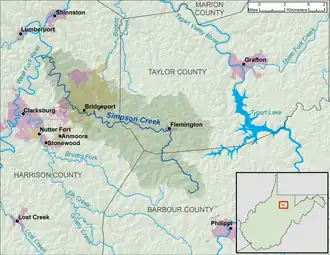 Via the West Fork, Monongahela and Ohio Rivers, Simpson Creek is part of the watershed of the Mississippi River, draining an area of 73 square miles (190 km2)[5] on the unglaciated portion of the Allegheny Plateau. It rises approximately 5 miles (8.0 km) northwest of Philippi in northwestern Barbour County and flows generally northwestwardly through southeastern Taylor County and northeastern Harrison County, passing through the communities of Flemington and Bridgeport; it flows into the West Fork River approximately 4 miles (6.4 km) south-southwest of Shinnston.[6]