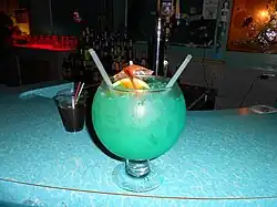 The bar has a bamboo ceiling,[3] traditional cocktails, local Montana microbrews and specialty drinks such as the "fish bowl",[7] a 64 US fl oz (1.9 L) cocktail[8] that has nine shots of different liquors.[7] It also has an outdoor patio open during the summer, from June to September.[9]