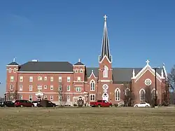 In 1846, a motherhouse was established at Maria Stein, Ohio, named after the Benedictine monastery Father Brunner had first joined. Brunner donated a painted depiction of the Miraculous Madonna of Mariastein to the convent.[9] It is said that Brunner had it with him when crossing the English Channel in a sailing vessel and was miraculously saved from shipwreck in a bad storm.[9] Today, the former convent at Maria Stein continues as a center of prayer and community events and houses a museum as well as the Shrine of the Holy Relics. The Maria Stein Convent complex is on the National Register of Historic Places.