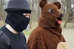 The colourful procession borrows motifs from similar carnival events: the bear was traditionally tied with a straw rope, typical for ber, a traditional procession popular across Greater Poland.[7] Today the bear wears fluffy, brown clothes and a mask. A chain is tied around the bear's waist and its jangling alerts residents about the Greys' approach.