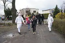 The police officer is another indication of the syncretic way of selecting procession characters: this character resembles the leader of similar żandary parades from Poznań.[8] The police officer leads the procession, marches in the front and chooses the route. Police officers stop cars passing by to give the drivers "holiday fines" and knock on the doors of nearby houses so the hosts admit the procession and offer the participants some refreshments. The police officer collects donations offered by passers-by, drivers or other people. The person playing this role must be sociable and able to integrate the group and make people laugh.