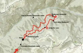 The main tourist attraction of the park - Skakavac waterfall - can be reached by trail.[7] The trailhead is accessible by bus or car and by foot.[8] Visitors can travel to the waterfall trailhead from Nahorevo or hike from Sarajevo through Nahorevo and the Skakavac Nature Preserve.[7] The waterfall may also be reached by vehicle, with rest areas available along the trail.