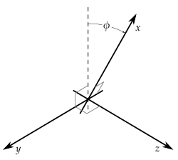 The simplest 3D case of a skew coordinate system is a Cartesian one where one of the axes (say the x axis) has been bent by some angle , staying orthogonal to one of the remaining two axes. For this example, the x axis of a Cartesian coordinate has been bent toward the z axis by , remaining orthogonal to the y axis.