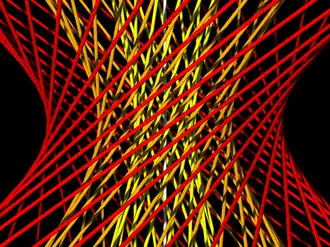 An affine transformation of this ruled surface produces a surface which in general has an elliptical cross-section rather than the circular cross-section produced by rotating L around L'; such surfaces are also called hyperboloids of one sheet, and again are ruled by two families of mutually skew lines. A third type of ruled surface is the hyperbolic paraboloid. Like the hyperboloid of one sheet, the hyperbolic paraboloid has two families of skew lines; in each of the two families the lines are parallel to a common plane although not to each other. Any three skew lines in R3 lie on exactly one ruled surface of one of these types.[3]