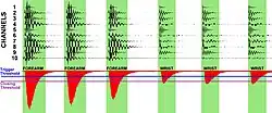 Skinput has been publicly demonstrated as an armband, which sits on the biceps. This prototype contains ten small cantilevered Piezo elements configured to be highly resonant, sensitive to frequencies between 25 and 78 Hz.[4] This configuration acts like a mechanical Fast Fourier transform and provides extreme out-of-band noise suppression, allowing the system to function even while the user is in motion. From the upper arm, the sensors can localize finger taps provided to any part of the arm, all the way down to the finger tips, with accuracies in excess of 90% (as high as 96% for five input locations).[5] Classification is driven by a support vector machine using a series of time-independent acoustic features that act like a fingerprint. Like speech recognition systems, the Skinput recognition engine must be trained on the "sound" of each input location before use. After training, locations can be bound to interactive functions, such as pause/play song, increase/decrease music volume, speed dial, and menu navigation.