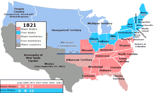 Controversy over whether Missouri should be admitted as a slave state resulted in the Missouri Compromise of 1820, which specified that territory acquired in the Louisiana Purchase north of latitude 36° 30', which described most of Missouri's southern border, would, except for Missouri, become free states, and territory south of that line would become slave states. As part of the compromise, Maine, on August 19, 1821, was admitted as a free state.[11]