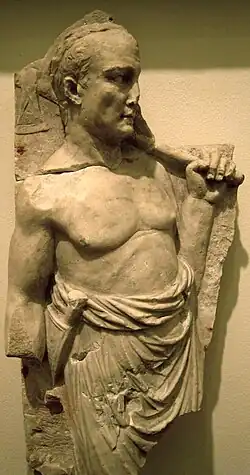 Roman culture produced artistic responses to the visibility of captives as early as the Punic Wars, when the comic playwright Plautus wrote the Captivi ("Captives", ca. 200 BC).[198] The cultural assumption that enslavement was a natural result of defeat in war is reflected in the ubiquity of Imperial art depicting captives, an image that appears not only in public contexts that serve overt purposes of propaganda and triumphalism but also on objects that seem intended for household and personal display, such as figurines, lamps, Arretine pottery, and gems.[199]