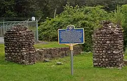 The station is also close to the original entrance gate to Sloatsburg's Cappamore Farm. The house in the nearby mountainside was built around 1900 as an estate for Nicholas T. Brown, a local alderman from Paterson, New Jersey.[12] This estate and farm gave a panoramic view of the countryside around Sloatsburg. The house was demolished during the construction of the New York State Thruway in 1956. The steel bridge over the Ramapo River and the wooden bridge over Sloat's Millrace were removed as they had become hazardous. Today, all that remains are the stone pillar entranceway, and a walking trail to the nearby Sloat's Dam.[13] The gateposts are listed on the National Register of Historic Places along with the remaining mill and dam structures since they used the same stonework.[14]