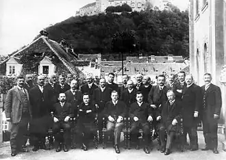 The Slovene People’s Party was founded under the name Catholic National Party (Katoliška narodna stranka) in 1892 in Ljubljana with the aim of working in the Carniola region. On 27 November 1905, the ruling body of the party adopted a motion changing the name to Slovene People’s Party. Under the influence of Ivan Šusteršič, Evgen Lampe and Janez Evangelist Krek, the party evolved in the early years of the new century from a conservative party into a Christian Social party, based on mass support. The main plank of its programme was support for workers and farmers. Šusteršič, Krek and their colleagues worked to establish a broad network of cooperatives and lenders, which offered credit on favourable terms and assistance. By 1907, they had already established 433 collectives.