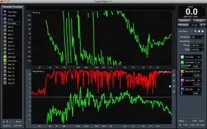 In spectrograph view, Smaart displays a real-time spectrum analysis, showing the relative strength of audio frequencies for one audio signal. Needing only one channel of audio input, this capability can be used for a variety of purposes. With Smaart's input connected to the mixing console's pre-fade listen (PFL) or cue bus, spectrograph view can display the frequency response of individual channels, several selected channels, or various mixes.[8] Spectrograph mode can be used to display room resonances: pink noise is applied to the room's sound system, and the signal from a test microphone in the room is displayed on Smaart. When the pink noise is muted, the display shows the lingering tails of noise frequencies that are resonating.[8]