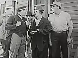 ![]() (R to L) Jack Gavin, Stan Laurel, George Rowe, and William Gillespie in Smithy | |