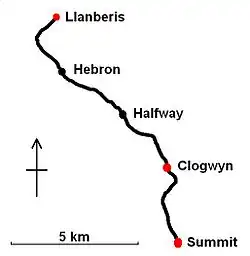 | Llanberis | 53°06′59″N 4°07′10″W / 53.1163°N 4.1195°W | 353 ft (108 m) | Has two platforms. The first stretch of line is uphill at 1 in 50, steep for a main line but shallow compared with the 1 in 6 incline that begins shortly afterwards. |