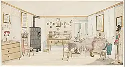 A major social change occurring between 1750 and 1850, depending on region, was the end of the traditional "whole house" ("ganzes Haus") system, in which the owner's family lived together in one large building with the servants and craftsmen he employed.[2] They reorganized into separate living arrangements. No longer did the owner's wife take charge of all the females in the different families in the whole house. In the new system, farm owners became more professionalized and profit-oriented. They managed the fields and the household exterior according to the dictates of technology, science, and economics. Farm wives supervised family care and the household interior, to which strict standards of cleanliness, order, and thrift applied. The result was the spread of formerly urban bourgeois values into rural Germany.[3]