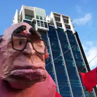 Members of Socialist Alternative assisted in the construction of this effigy of former Prime Minister John Howard, made by the Victorian College of the Arts Student Union. The building in the background is RMIT University, occupied during a demonstration against education cuts in 2005.