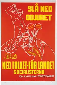 When Flyg died in 1943, he was succeeded as party leader by Agaton Blom. During the final years of the war, the party continued to lose members and support, and changed its name to the Swedish Socialist Party (Svenska socialistiska partiet), which was outspokenly supportive of Nazi ideology.[5] The Swedish Socialist Party participated in the 1944 election and received 5,279 votes or 2 per thousand; they probably never reached a thousand members. The party was disbanded in 1948.