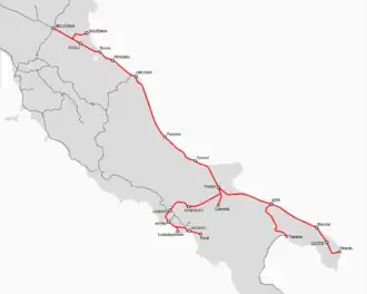 The Southern Railways was established in 1862 to build a railway from Ancona to Brindisi. Although this was originally a Rothchild's promotion, it was founded as an Italian company led by Count Pietro Bastogi of Livorno. By 1865 it completed its line to Brindisi and it opened a branch from Bari to Taranto in 1868.[1] In the reorganisation of Italian railway concessions on 1 July 1865, it acquired the line from Bologna to Ancona and the branch from Castel Bolognese to Ravenna from the General Roman Railway Company.[2]