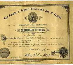 The society provided school examinations such as arithmetic, geography, history, grammar, drawing, Latin, French, algebra and bookkeeping. In early 1885, Henry Valentine Goold presented the prizes at St John's College, Grimsargh, Preston, Lancashire, where the boys had taken the Society's exams and the principal, Reverend T. Abbott Peters, M.A., was a Fellow of the Society.[38] In 1886 at the Convent of Jesus and Mary, Ipswich, all eighteen pupils who took examinations passed with honour certificates or honours in individual subjects, such as French, music, botany, bookkeeping, English, German and drawing.[68] In 1887, nineteen out of the twenty candidates at St. Joseph's College, Weston Hall, Rugby passed the exam and received the Society's certificate.[69] In the same year at the Ursuline Convent, Upton, Essex, most pupils took the Society's exams. Many candidates obtained maximum marks, some earned Honours, and one candidate Miss Winifred Wilson received a silver medallion.[70] In 1890 at St Rose's Convent School, Stroud, its female pupils took part in a competition and exhibition of work which was posted to the Society's Kensington base. Two girls obtained certificates with honours for their oil paintings: E. Hanman and Nellie Mackey. Mary Culler won the same for her map drawing. The pupils took the Society's exams in nine subjects, including scripture, grammar, freehand and model drawing, French, theory of music, history and literature, with Hanman and Mackey winning Honours while Gertie McKay aged 12 received a certificate too.[71] In 1891, the Society was cited as the exam board for Euston College, England, in its prospectus.[72]