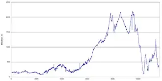 In addition, elevation changes over a race route can dramatically change the amount of power needed to travel the route. For example, the 2001 and 2003 North American Solar Challenge route crossed the Rocky Mountains (see graph at right).