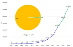 A law requiring 35% of electricity from renewable resources by 2024 and carbon emission reductions of 50% below 2000 levels by 2050 was introduced in 2012.[5][6] Combined with declining solar installation costs, it was estimated that the 2012 climate law would lead to 6 GW of solar capacity in Mexico by 2020.[7] At the Solar Power Mexico conference, it was said that PV electricity and solar thermal would comprise up to 5% of Mexico's energy by 2030 and up to 10% by 2050.[8] The first long term energy auction was held in 2015 with a second one in 2016. Solar PV was successful in both, securing 1,691 MW of the 2,085 MW auctioned in the first and 1573 MW of 3473 MW in the second auction.[9]