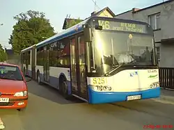 The first generation Solaris Urbino 18 was produced from the second half of 1999. This model was to supplement Solaris' offer on large buses, 18-metre buses for public transportation services. The first Solaris Urbino 18 bus unit went to PKA Gdynia in 1999, it was also the only new low-floor articulated bus bought in 1999 by transport companies in Poland.[9] Initially, the 18-metre buses did not sell well because the transportation companies preferred smaller and cheaper 15-metre vehicles.[10] The bus market expanded between 1996 and 2002, which resulted in the later increase in demand for 18-metre buses.[11] In total, cities in Poland bought 12 units of the Solaris Urbino 18 First Generation. Articulated vehicles were mainly built for export, most Solaris Urbino 18 were bought by a company from Berlin and Riga. A characteristic feature of the bus are the painted railings instead of clear varnish yellow paint.[12]