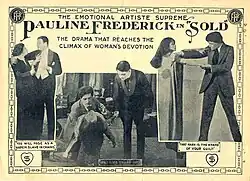 Sold is a 1915 American silent drama film produced by Famous Players–Lasky and distributed by Paramount Pictures. Based on George Erastov's play of the same name (which was an adaptation of the Henri Bernstein French play Le Secret), the film starred stage actress Pauline Frederick and was directed by Hugh Ford and Edwin S. Porter.[1] The film was re-released in 1919 by Paramount. It is now considered lost.[2]