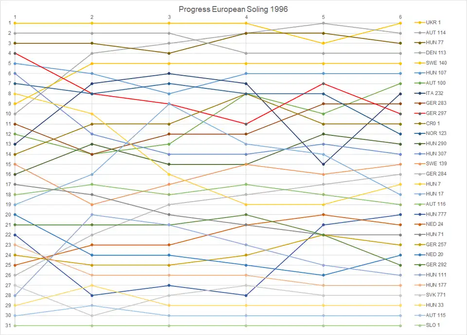JESPER BANK'S EUROPEANS" (PDF). soling.com. International Soling Association. Retrieved 26 January 2022. - ^ "Soling European Championship" (ASCII). site-isaf.soticcloud.net. World Sailing. 19–27 September 1996 [1995]. Retrieved 27 January 2022.