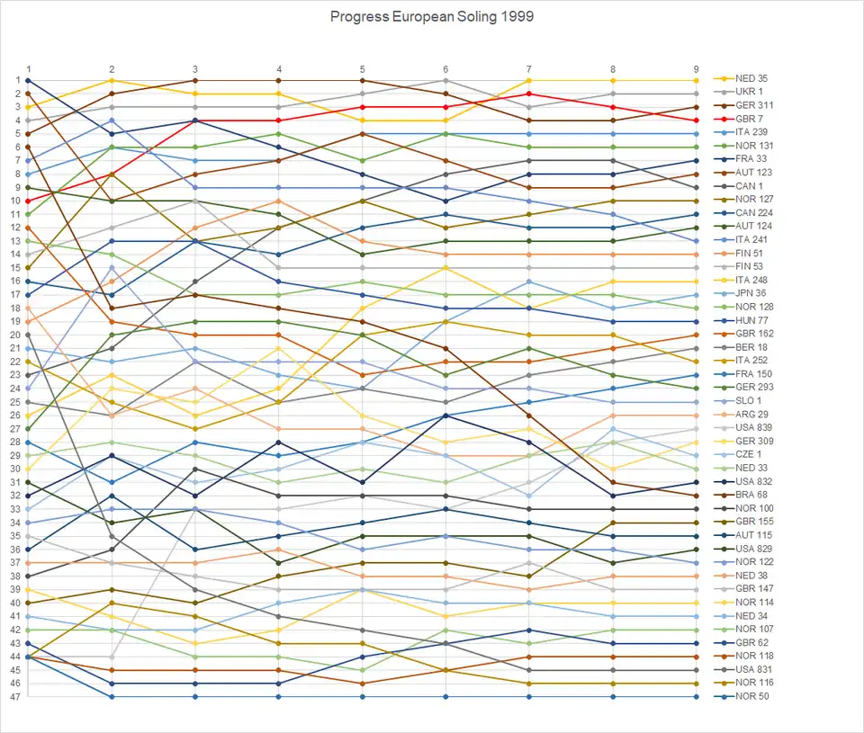 - ^ "SOLING EUROPEAN CHAMPIONSHIP" (ASCII). site-isaf.soticcloud.net. World Sailing. 24 July – 1 August 1999 [1999]. Retrieved 30 January 2022.