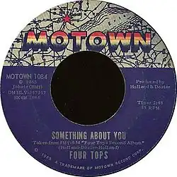 "Something About You" was released as the third single from the Four Tops' Second Album, following "I Can't Help Myself" and "It's the Same Old Song". The song reached #19 on the Billboard Hot 100 and #9 on the Billboard R&B chart.[1][2] The B-side of the single was "Darling I Hum Our Song."[3] "Something About You" has appeared on numerous compilation albums, including The Ultimate Collection.[4]