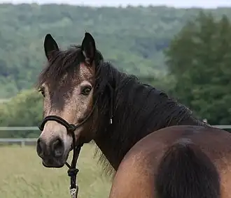 Although this trait has been called the "sooty gene", similar coat-darkening conditions studied in mice suggest that coat darkening is a polygenic trait.[4] Just as in horses, the degree of sootiness in mice varies widely; some individuals have darker hairs that form a dorsal line, while others have extensive sootiness throughout.[5] A statistical analysis of 1,369 offspring of five Franches-Montagnes stallions indicated that darker shades of chestnut and bay might follow a recessive mode of inheritance.[6]