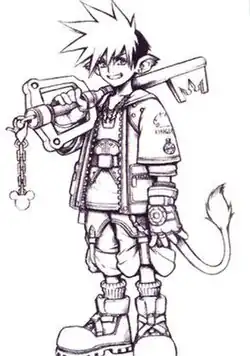 Sora was designed by Tetsuya Nomura as the protagonist of Kingdom Hearts. He was not originally slated to be the protagonist, as Disney wanted Donald Duck to fill the role, while Square wanted Mickey Mouse. Nomura designed Sora with the concepts of the Disney characters in mind, basing his outfit on Mickey Mouse's trademark white gloves, red shorts, and giant yellow shoes.[1] Sora originally wielded a weapon resembling a chainsaw; however, the weapon was not well received by Disney, which led Nomura to redesign the weapon into a Keyblade. He was also designed with lion-like features, which were removed as the staff found them to be similar to those of Final Fantasy IX protagonist Zidane Tribal. The design was further reworked after a talk with the Disney staff, and Nomura finished it after a night's work.[2] Because Sora was a new character in the first Kingdom Hearts, Square added Final Fantasy characters who support the protagonist.[3]