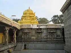 The temple is located in Thadikombu, a village in the outskirts of Dindigul in the South Indian state of Tamil Nadu. The temple occupies an area of 1.5 acres (0.61 ha) and is surrounded by rectangular granite walls on all four sides, with a 90 ft (27 m) tall rajagopuram (temple tower). All four sides around the temple are paved in such a way to accommodate movement of the temple car during festive occasions. The main entrance of the temple faces the East, and at the entrance of the temple there is a four pillared open hall. The temple has two precincts. The temple is a madakovil, with its plithe constructed in an elevated platform around 2 m (6.6 ft) in height. The parapets in the steps are decorated with curled yalis, the lion-faced Vijayanagara sculptures.[2][3]
