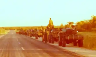 On 22 October, the SADF airlifted more personnel and a squadron of Eland armoured cars to bolster UNITA positions at Silva Porto.[75] Within days, they had overrun considerable territory and captured several strategic settlements.[74] The SADF's advance was so rapid that it often succeeded in driving FAPLA out of two or three towns in a single day.[74] Eventually the South African expeditionary force split into three separate columns of motorised infantry and armoured cars to cover more ground.[21] Pretoria intended for the SADF to help the FNLA and UNITA win the civil war before Angola's formal independence date, which the Portuguese had set for 11 November, then withdraw quietly.[66] By early November, the three SADF columns had captured eighteen major towns and cities, including several provincial capitals, and penetrated over five hundred kilometres into Angola.[74] Upon receiving intelligence reports that the SADF had openly intervened on the side of the FNLA and UNITA, the Soviet Union began preparations for a massive airlift of arms to FAPLA.[77]