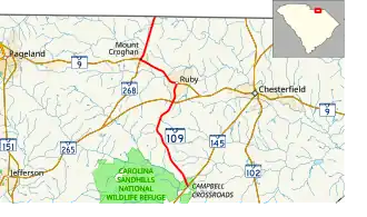 SC 109 is a two-lane rural highway that traverses from SC 145 through Ruby and Mount Croghan, to the North Carolina state line.[2]