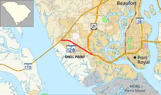 South Carolina Highway 128 (SC 128), is a 2.110-mile (3.396 km) state highway located entirely within Beaufort County, South Carolina. Also known locally as Savannah Highway, SC 128 serves as a principal arterial for the unincorporated Shell Point as well as providing a southern route serving Port Royal,[3] Marine Corps Recruit Depot Parris Island, and the Sea Islands east of Beaufort.