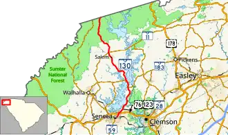 South Carolina Highway 130 (SC 130) is a 30.072-mile (48.396 km) state highway in Oconee County, South Carolina, connecting Clemson and eastern Oconee County with access to Lake Keowee, Lake Jocassee, and the Blue Ridge Mountains.