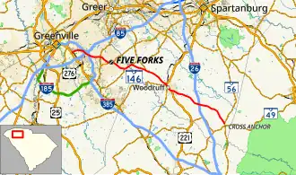 SC 146's western terminus is at Laurens Road (U.S. Route 276 or US 276), near the intersection of Interstates 85 (I-85) and 385.[3] Its course then goes in a southeasterly direction where its eastern terminus is at its intersection with SC 56 near Cross Anchor.[3]