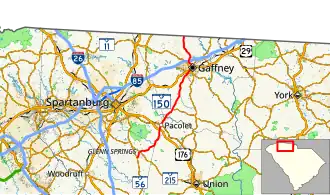 South Carolina Highway 150 (SC 150) is a 33.580-mile (54.042 km) primary state highway in the U.S. state of South Carolina. The highway connects Pacolet and Gaffney with the more rural areas of Spartanburg and Cherokee counties.