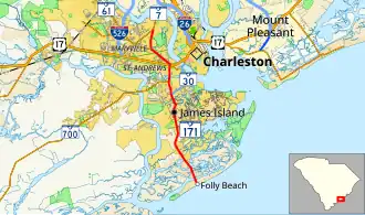 SC 171 begins at an intersection with Arctic Avenue in Folly Beach; the Folly Beach Fishing Pier and the Atlantic Ocean lie to the south. The route heads north-northwest through Folly Beach's business district as Center Street. From here, the highway crosses the Folly River onto Long Island; this crossing is the only road connecting Folly Island to the rest of South Carolina. The road passes several homes before crossing to James Island, where it turns to the north as Folly Road. After crossing James Island Creek, the highway meets the southern terminus of SC 30, also known as the James Island Connector. Past this junction, SC 171 intersects the eastern terminus of SC 700 before crossing Wappoo Creek to leave James Island. The highway heads through a mainly residential area to intersect U.S. Route 17; shortly thereafter, the route meets SC 61, and the two routes head west-northwest concurrently. After passing through a business district for 1.6 miles (2.6 km) the two highways separate, and SC 171 again heads northward. The highway passes Charles Towne Landing, a state historic site and the location of the first permanent English settlement in the state, before merging into SC 7 at its northern terminus.[2][3]