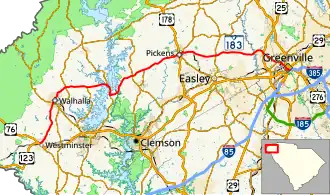 SC 183 begins at an intersection with U.S. Route 76 (US 76) and US 123 in Westminster. It travels north to Walhalla and then east to meet SC 130 for a short concurrency on Rochester Highway near the Oconee Nuclear Station at Lake Keowee in Seneca in Oconee County.[4][5] The road, known as East Pickens Highway, moves east by northeast over a tributary that feeds into Lake Hartwell where the road name changes to Walhalla Highway as the highway enters Pickens County, 1.22 mi (1.96 km) eastward.[6] Upon entering Pickens County, the highway travels 4.3 mi (6.9 km) north by northeast before intersecting at SC 133.[6] SC 183 moves 2.1 mi (3.4 km) where it intersects Six Mile Road, the northern terminus of SC 137.[6] Traveling east by northeast on Walhalla Highway, SC 183 goes 5.8 mi (9.3 km) before reaching downtown Pickens, the county seat. SC 183 travels concurrently with US 178 through downtown Pickens on Main street for 0.02 mi (0.032 km) on East Main Street.[6] The highway travels 0.19 mi (0.31 km) where it intersects SC 8.[6] Traveling concurrently with SC 8 for 0.44 mi (0.71 km) northeastward on Jewel Road, SC 183 splits off from SC 8 to become Farrs Bridge Road.[6] SC 183 moves 5.64 mi (9.08 km) where it intersects SC 135 at Dacusville Road.[6] It then moves eastward 8.32 mi (13.39 km) where it intersects US 25 in Greenville County, crossing over the Saluda River in the process.[6][7] Traveling southeastward for 0.91 mi (1.46 km), SC 183 enters Berea.[7] Once SC 183 passes West Parker Road, the road names changes to Cedar Lane Road, then travels an additional 1.70 mi (2.74 km) to reach West Blue Ridge Drive at SC 253.[7] SC 183 travels an additional 1.79 mi (2.88 km) southeast, becoming Pete Hollis Boulevard, and intersecting Stone Avenue and Rutherford Street.[7] It has a second intersection with US 123 at North Academy Street in downtown Greenville a further 0.41 mi (0.66 km) southeast.[8][7][9] Then, it continues to the southeast and reaches its eastern terminus, an intersection with US 29 (Church Street).