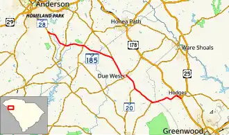 South Carolina Highway 185 (SC 185) is a 26.920-mile (43.324 km) state highway in the U.S. state of South Carolina. The highway connects Hodges and Due West with the Homeland Park area.