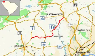 South Carolina Highway 186 (SC 186) is a 14.960-mile-long (24.076 km) state highway in the U.S. state of South Carolina. The highway connects rural areas of Pickens County with Slater-Marietta in Greenville County.