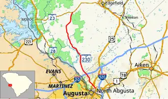 South Carolina Highway 230 (SC 230) is a 20.730-mile (33.362 km) state highway in the U.S. state of South Carolina. The highway connects North Augusta with the Sumter National Forest.