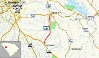 South Carolina Highway 248 (SC 248) is a 6.170-mile (9.930 km) primary state highway in the U.S. state of South Carolina. It serves as main access to the Ninety Six National Historic Site.