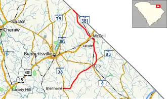The highway was established in 1930 as a new primary route from SC 38 in Blenheim to SC 9 in Clio. In 1931 or 1932, it was extended north to SC 30 (today U.S. Route 15 (US 15) and US 401) in McColl; and west to the community of Marlboro. In 1934, the western extension was dropped while it extended north again to the North Carolina state line. In 1940, SC 381 was extended west again to SC 382 in Scott, only to be truncated back in Blenheim by 1948.[3]